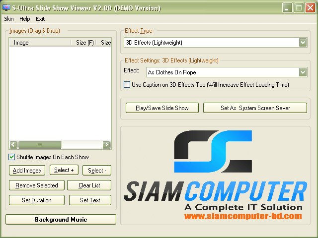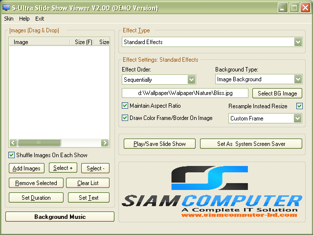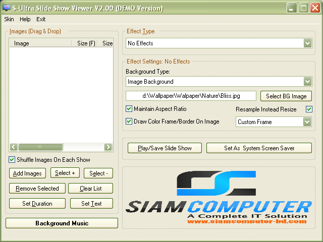 Slide Show Viewer lets you queue up images with which to play slide shows. You can even choose amongst a variety of special effects or add some background music to the show to make it more engaging.