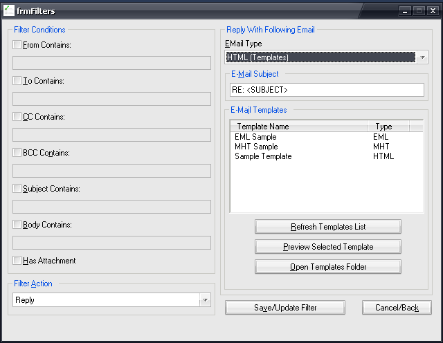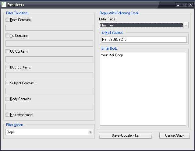 - Filter supports: From, To, CC, BCC, Subject, Body and Attachment conditions.